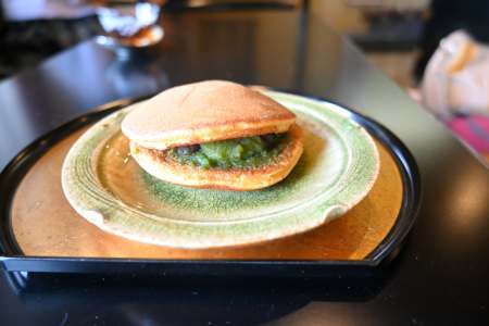 材料選びにも時間をかけ、今年1月から同店と打ち合わせを始めた。どら焼きの皮で、粒あんと求肥、こしあんを挟み、さわやかさを出すため、オレンジピールを粒あんに混ぜた。白あんにかぶせ茶を練りこみ、求肥にもかぶせ茶を混ぜた。当初、かぶせ茶の風味を感じにくく、納得のいくまで試作を重ねた。その結果、ほかにはない、極上の逸品に仕上がったという。餡が苦手だったメンバーも、かぶせ茶の風味で美味しく食べられたという。