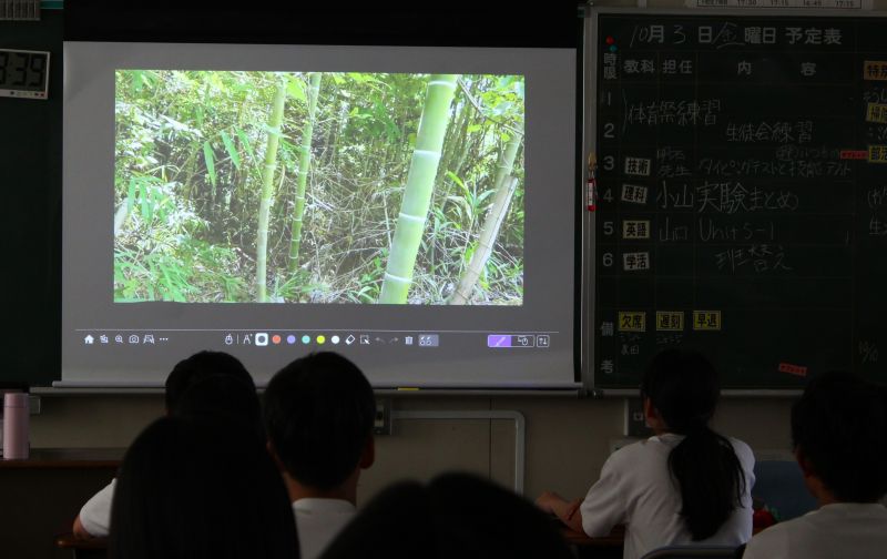 生徒たちは、竹林の現状と、一緒に考えてくれる支援者の会社がどんなものをつくり、どんな活動をしているかの動画を見て、グループに分かれて意見を出し合った、支援者は、できるだけ、生徒の自主的な発言を伸ばすよう、生徒たちにリードを任せた。