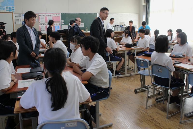 授業は2年2組の教室であり、生徒約30人と、「授業支援者」として、三重県中小企業家同友会の6人(中村製作所の山添卓也さん、東海テクノの市田明さん、前田テクニカの前田昌彦さん、前野段ボールの前野大喜さん、わくわくスイッチの中村憲和さん、日パック工業の小石原祐子さん)らが参加した。