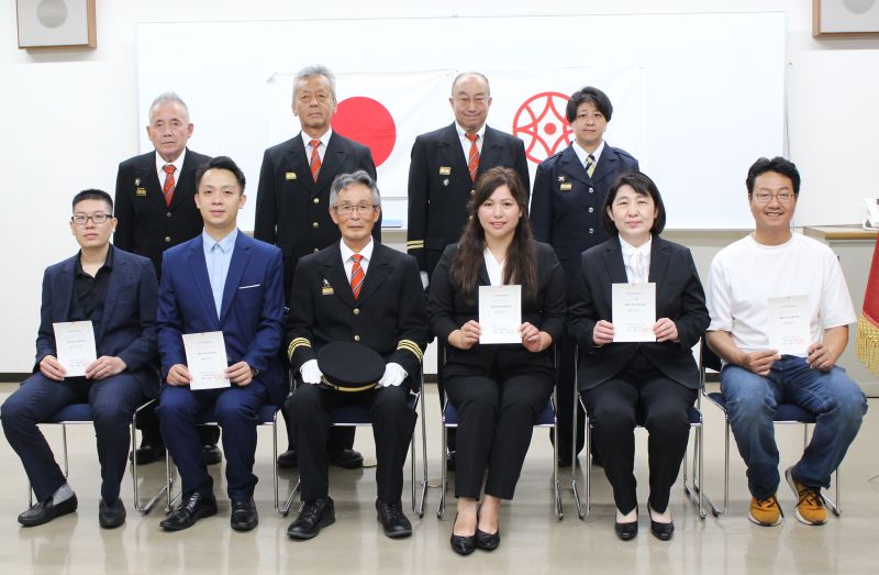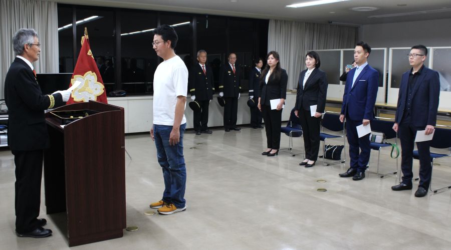 消防団の加藤友久団長から1人ずつ辞令を受け取った。今後は「機能別団員訓練指導班」のメンバーとして活動する。加藤団長は「外国人の住民は、母国と日本の文化や自然の違いから、戸惑いを感じる場面があると思う」とし、外国人も安心して住める地域づくりのために活動してほしいと呼びかけた。