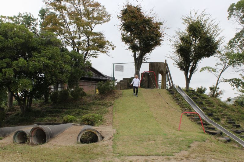 なかよし山は、開校当時の50余年前にできた遊び場という。校舎を建設する前の整地などで出た石をみんなで協力して運び、土で覆い、小山になったという。地域の人や先生、子どもたちが「みんな仲良く過ごすように」と願ってついて名前だ。5メートルほどの高さの山には芝のゲレンデや滑り台、土管の遊具などがあり、子どもたちが遊んでいる。