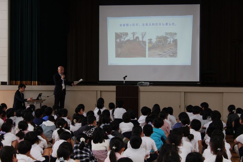 式典は体育館であり、全校児童360余人や教職員のほか、三重県緑化推進協会、「日永梅林・登城山を復活させる会」などの来賓17人も参列した。小学校から、おそらく最も近いコンビニと思われる三重県立総合医療センター店を経営する太田隼輝さんが「今度、お店に来た時には、少しでいいので募金に協力してね。緑が増えます」とあいさつした。