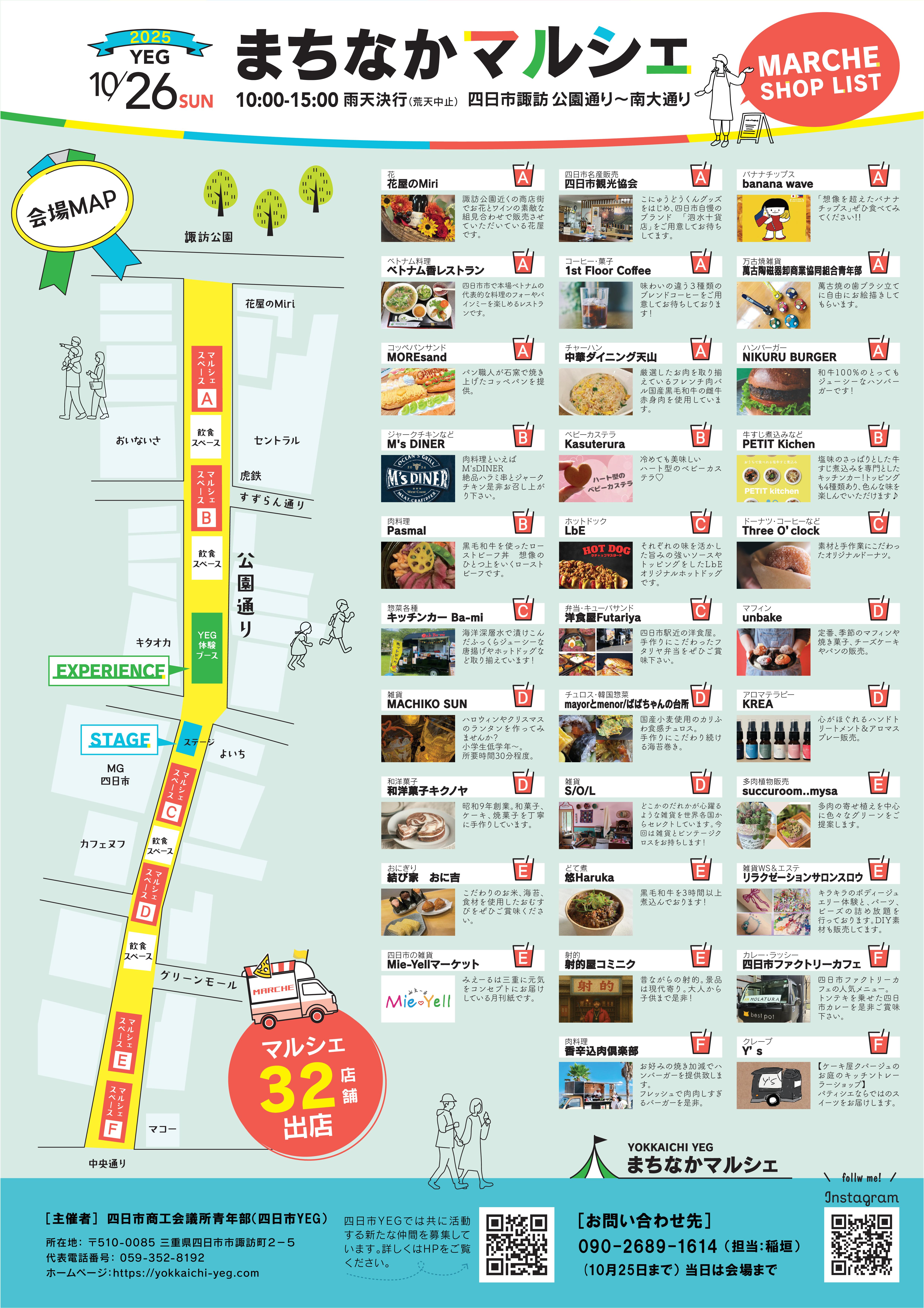主催の四日市商工会議所青年部の担当者は、「マルシェで四日市魅力体験などを通して、さらなる地域への関心を持っていただきたい。また、出店者や四日市YEGメンバーとの触れ合いの中で、共に街を盛り上げるきっかけとなれば嬉しい。ご家族や友人と一緒に、秋の素敵な一日を過ごしに来てほしい」と来場を呼びかけている。
