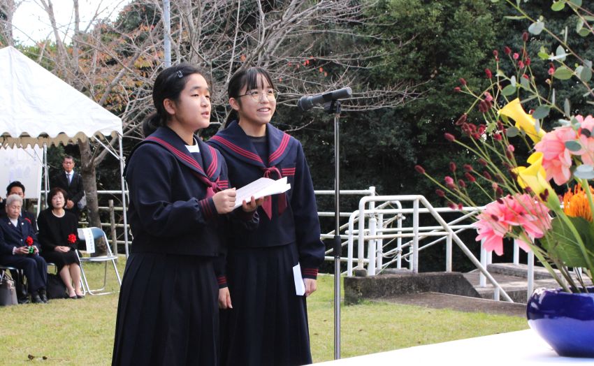 富田中学の生徒を代表し、3年生の小澤花音さん、橋本美春さんが忠霊塔の前に立ち、平和への誓いを読み上げた。「戦争の原因は、宗教や経済、民族感情や国益など、複雑なものです。『戦争はかわいそう』『してはいけない』と言うだけでは、戦争は止まりません。だからこそ、私たちは知識を深め、無知を減らし、話し合いを大切にします」などの言葉が、出席者の胸に響いた。