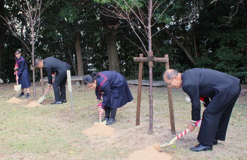 出席者が献花したあと、戦後80年の記念として、平和の祈りを込めた桜の木を、中学生2人と森市長、橋川遺族会長とで植樹した。