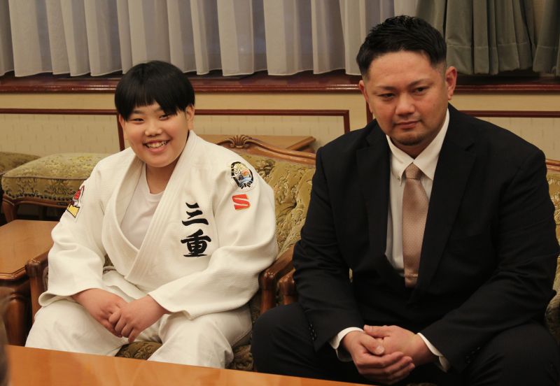 表敬には伊藤さんが通う神前柔道教室の坂下博夫代表、父で指導者の雅大さん(40)、母の葉子さん(39)が同行した。伊藤さんは三重県代表の柔道着を身に着け、森市長や市議会の荒木美幸副議長らに迎えられた。