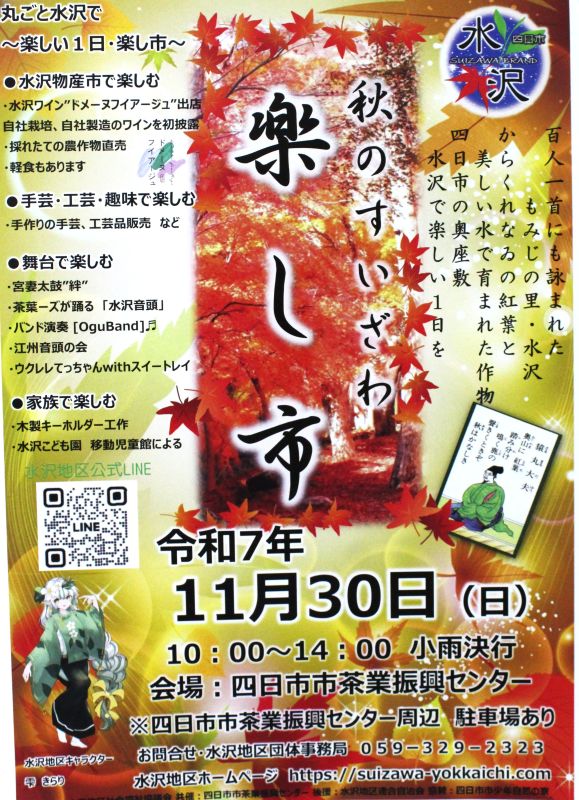 11月30 日は水沢地区の催し「秋のすいざわ 楽し市」が市茶業振興センターなどで開かれる。地区の農作物や手芸品などの販売、宮妻太鼓“絆”や茶葉ーズが踊る「水沢音頭」などのステージ演目でにぎわう。ドメーヌ・フイアージュのみなさんも会場で自社栽培、自社製造のワインが地元で誕生したことを報告する。同時に、醸造施設などがある会社では、11月30日と12月の毎週土曜日を直売日とし、購入予約をした客への引き渡しもする。