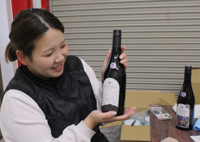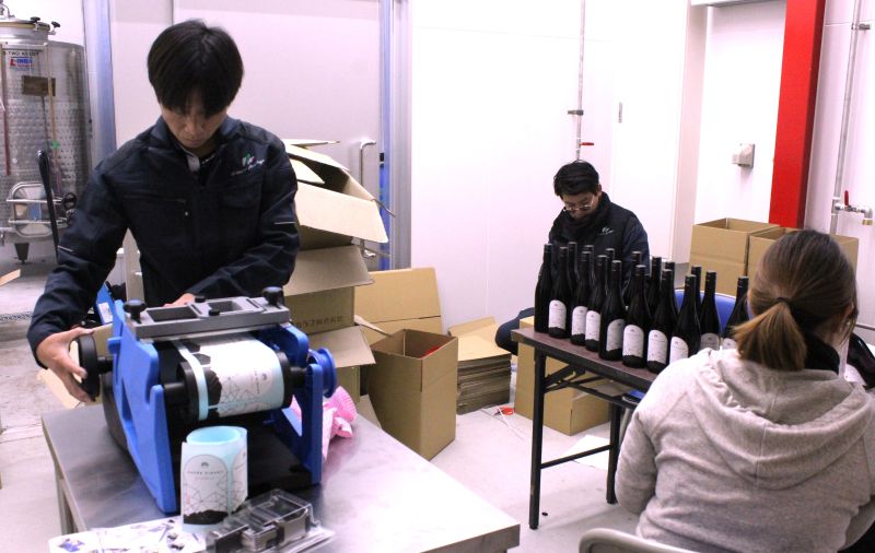ワインは製品によってラベルのデザインは異なるが、11月13日午後の作業ではシラーとムールヴェドルの品種を用いた「キュヴェ・キララ」のボトルに、菰野町で開催されている「菰山展」にも出展している画家、佐野洋平さんに提供してもらったデザインのラベルが貼られていた。水沢地区で見る山の稜線と、幾何学模様のような細い線が重なるデザインだ。ラベルは商品によって異なるが、初披露に向けてのラベル貼りは約2200本分を予定しているという。