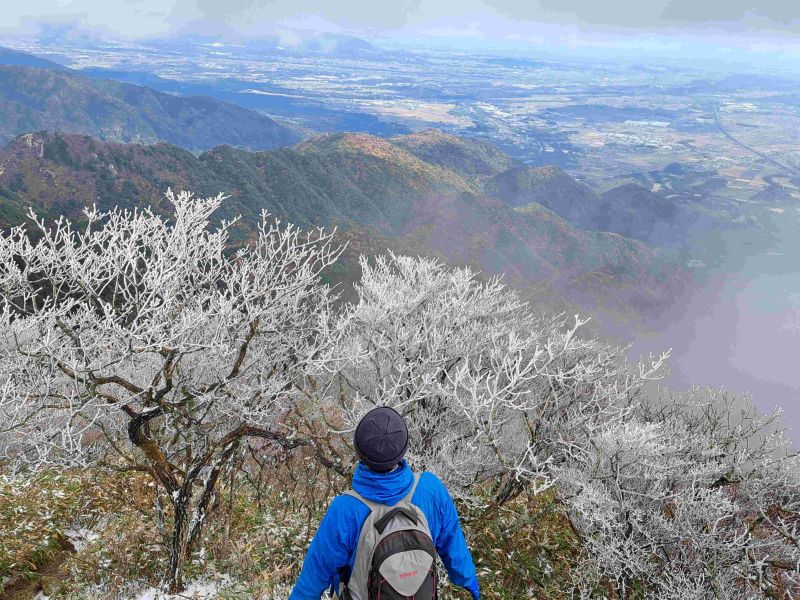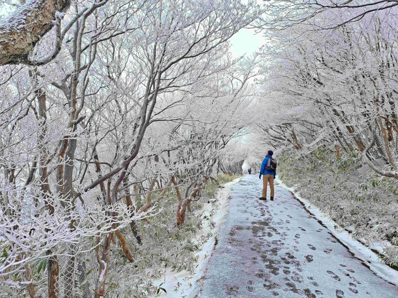 19日の朝7時ごろの気温はマイナス1度で、標高1000メートル付近(白鉄塔付近)から積雪となり、山上公園では2~3センチ積もったという。山上の木々の枝も白い氷の花に覆われた。