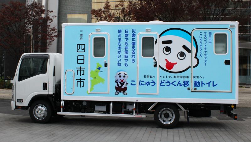 三重県四日市市は、災害被災地のトイレ不足を自治体の相互協力で解消するため、トイレトラックを導入し、11月25日、市民公園でお披露目した。市のマスコットキャラクターを車体にあしらった「こにゅうどうくん移動トイレ」で、被災地へ応援に駆けつけるほか、ふだんは市内のイベントなどで利用してもらうという。