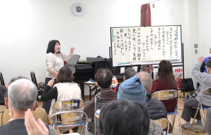 歌うことは呼吸のコントロールや口の周りの筋肉の訓練にもなり、最後の方では、太鼓や鈴、鳴子などを手に、歌に合わせて体を動かした。腹式呼吸の基本や早口言葉などによる訓練もした。