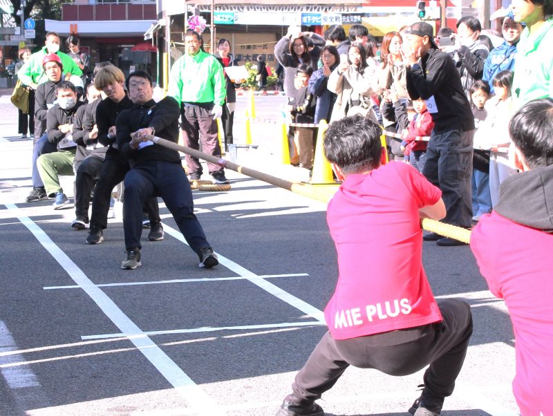 第1回四日市綱引きグランプリが11月30日、三重県四日市市の四日市諏訪新道通り特設会場で開かれた。企業や団体など24チームが参加し、チームが心をひとつにして懸命に綱を引っ張った。