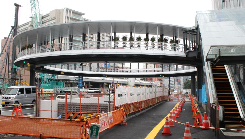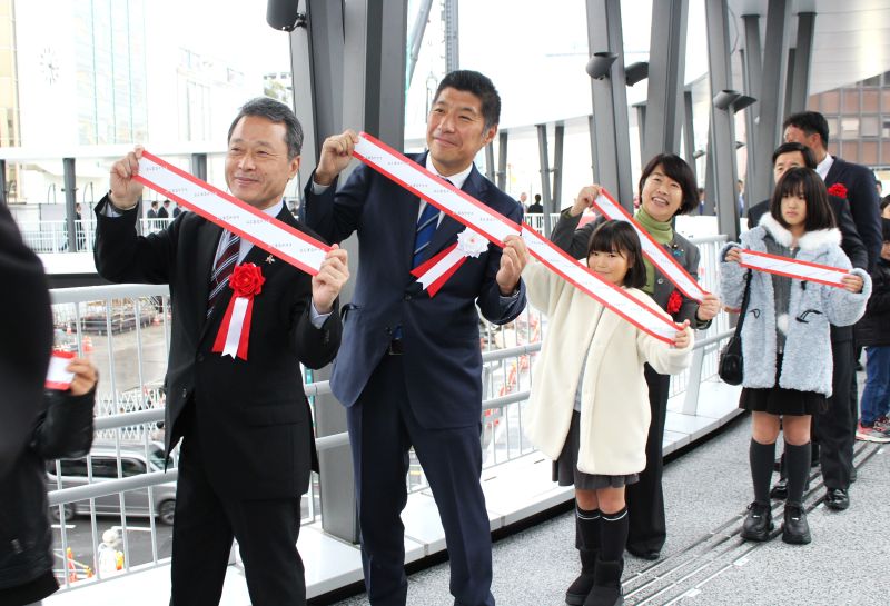 三重県四日市市で12月20日、円形デッキの完成式典があり、一般から募集し、市民投票で決めた愛称「よんまるテラス」が発表された。1周が100メートルを超える円形の橋の上には、国、県、市の関係者らのほか、市立浜田小学校の4年生も招待され、大人と合わせ約160人が輪になって、みんなでテープカットをした。