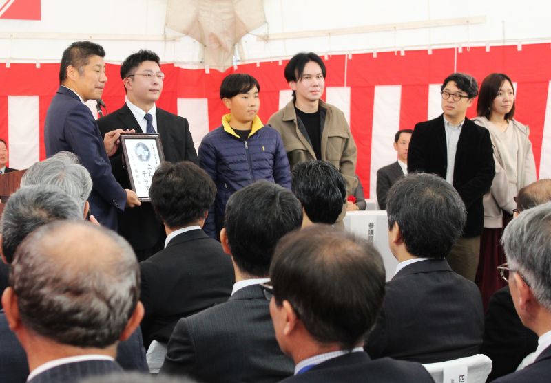 愛称には1万件を超すアイデアが寄せられたが、このうち、「よんまるテラス」の名で応募した桑名市の伊藤啓行さん、四日市市の鶴岡拓也さん、大森慶さん、松田拓也さん、伊藤陽香さんの5人が式典で紹介され、森市長が名付け親への感謝の品を5人の代表の鶴岡さんに手渡した。
