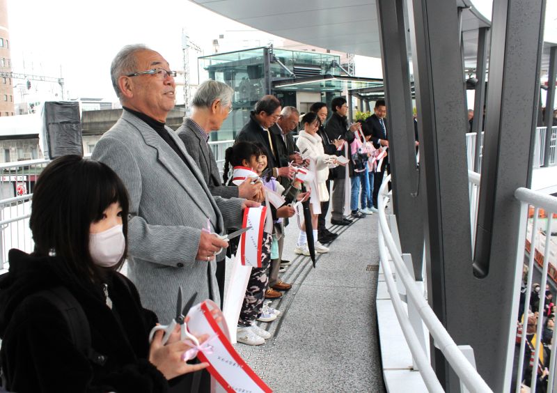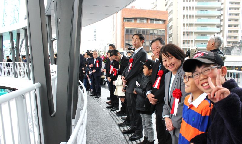 円形デッキの「よんまるテラス」は直径約40メートルで、高さ約6メートルになる歩行用の床部分に関係者や来賓ら大人と、浜田小の子どもたちが交互に並んで円をつくった。創立150周年を迎えた浜田小では、地域を学ぼうと、子どもたちが市役所を訪ねたりして円形デッキを調べていて、その縁もあってテープカットに招かれたそうだ。