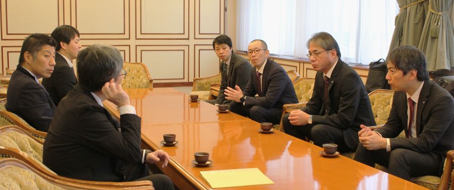 森智広市長(左側の手前から2人目)と懇談する労組の役員たち(右側)