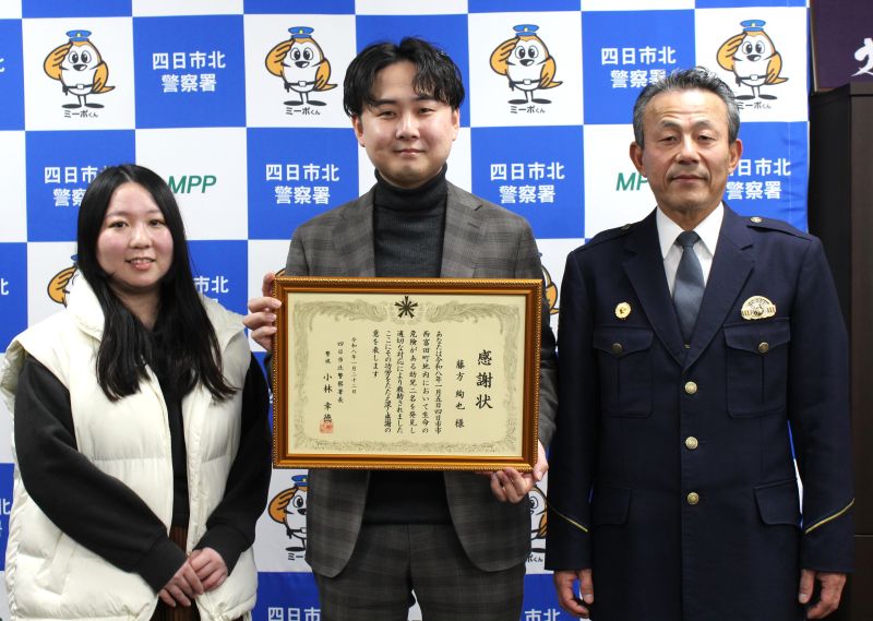 暗い夜の道路にいた幼児2人を保護したとして、三重県警四日市北署は1月22日、四日市市在住の会社員藤方絢也さん(33)に感謝状を贈った。道路は車の通行が少なくないうえ、横には深さ1メートルはあると思われる側溝もあったといい、2人が事故などに巻き込まれる恐れがあったという。