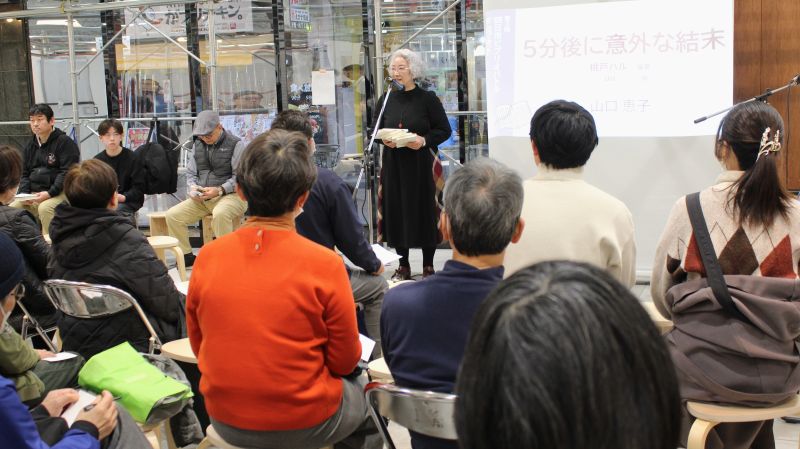 この日紹介されたのは「5分後に意外な結末」「やわらかい頭の作り方」「掟上今日子の備忘録」「現代こよみ読み解き辞典」で、5分間の持ち時間で紹介を競ったあと、会場の観客が投票して、最も読みたくなった本(チャンプ本)を決めた。1位は「現代こよみ読み解き辞典」を紹介した四日市市在住の加藤勝由さん(48)。今回は辞典を取り上げたが、ふだんから、幅広い分野の読書を夫妻で楽しんでいるという。
