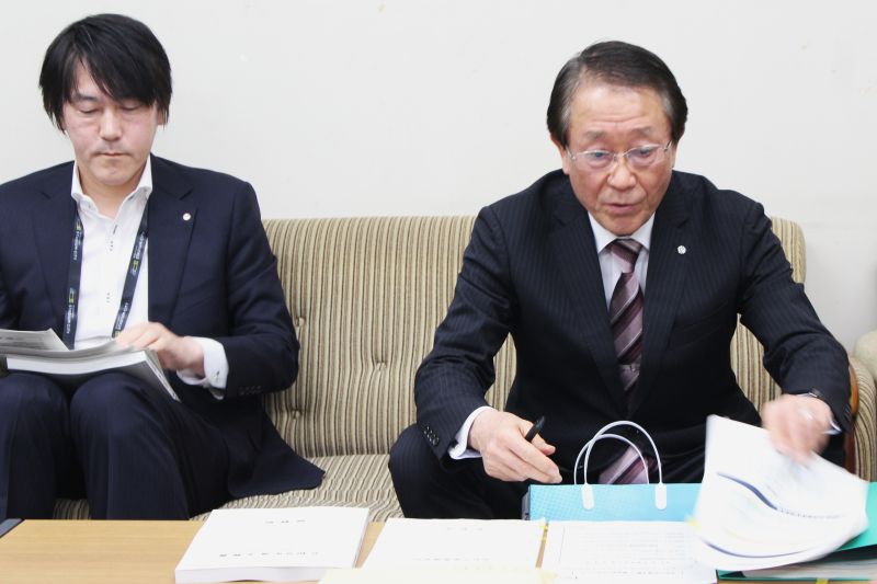 当初予算案を説明する諸岡高幸町長(右)ら