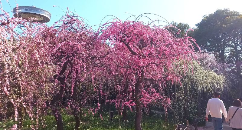 梅苑には約330本の枝垂れ梅があるといい、梅の樹の根元周りでは二ホンスイセンも咲き誇っている。天気のよい日には青い空と花のピンクの対比も美しい。夜はライトアップもあり、昼とは違う雰囲気を味わうことができる。