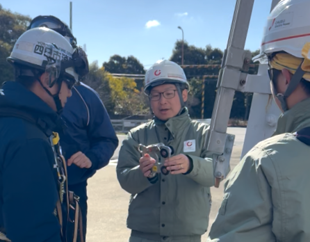 鉄塔を目の前に、中電側から設備や器具類の知識、非常時に鉄塔に登る昇降機の扱い方などの説明があった。このあと、昇降機を用いて鉄塔の上から人を地上へ降ろす訓練をした。