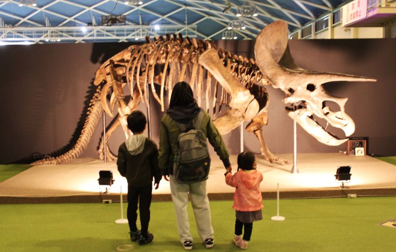 ティラノサウルスの頭骨レプリカや、トリケラトプス、ステラーカイギュウの全身骨格などは迫力がある。アンモナイトの化石など、さわることができる展示も会場の各所にあり、重さなどが体感できるようになっている。