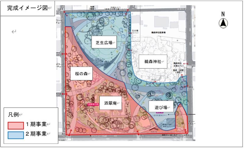 引き続き、鵜森神社に接する公園北西側の芝生広場、南東側の遊び場での2期工事が新年度から始まり、2027年度に全体のリニューアルが完成する。