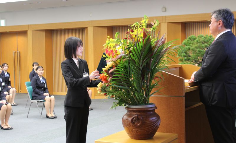 新入行員を代表しての感謝の言葉は、阿波野なづなさん(22)が務め、「私たちの生活は先行きが不透明な状況にあります。だからこそ、私たち一同は幅広い知識を吸収し、常に現状に満足することなく、前例がないことにも挑戦してまいります。失敗を恐れず、チャレンジ精神でひたむきに努力してまいります」などと決意を語った。