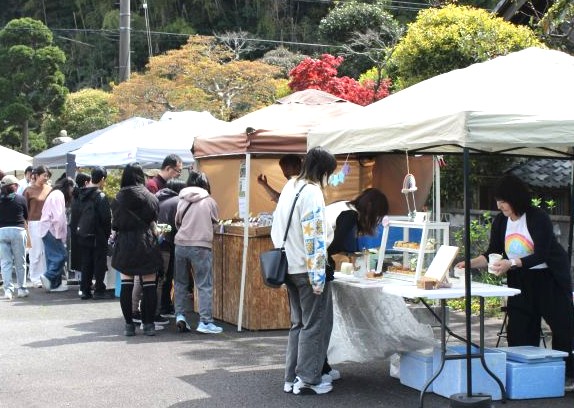 「垂坂山観音寺マルシェ」が4月12日、三重県四日市市垂坂町の同寺であり、昨年とは一転して好天にも恵まれ、にぎわった。お菓子や軽食、手作り雑貨、キッチンカーなど約35の店が開き、山門前の駐車場や境内は店の前で並ぶ人たちの姿が見られた。