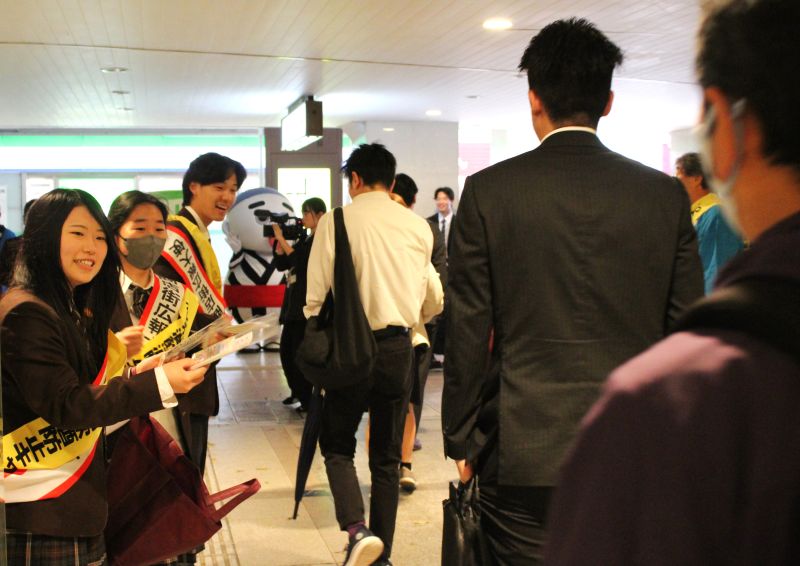 お酒を販売する側の社会的な責任として行っており、今回で11回目。酒販店のほか、コンビニ、市教育委員会、四日市南署、名古屋国財局、四日市税務署などの関係者も協力し、駅の出入りが増える午前7時半ごろから西、北口などに約65人が手分けして啓発チラシなどを配った。