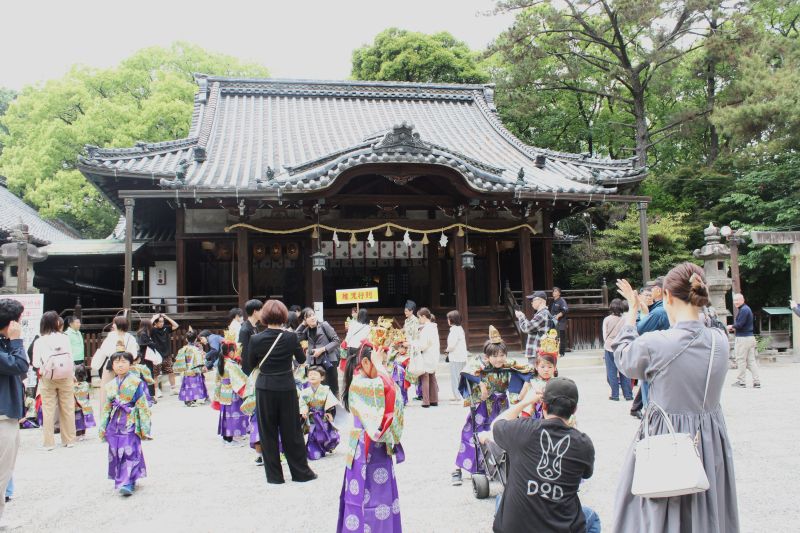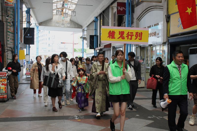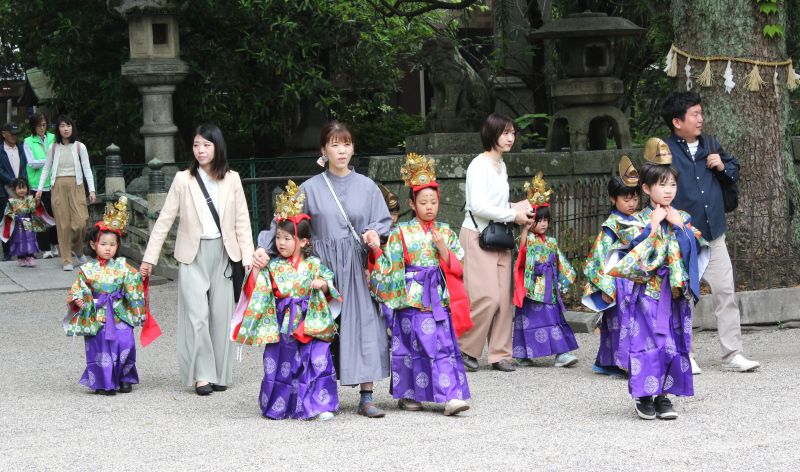 三重県四日市市の中心市街地にある四日市一番街商店街などで4月29日、稚児行列が行われた。今年は市内外から25人の子どもと保護者らが参加、商店街のアーケードを行列になって進み、到着した諏訪神社では祈祷をしてもらい、健やかな成長や無病息災を願った。
